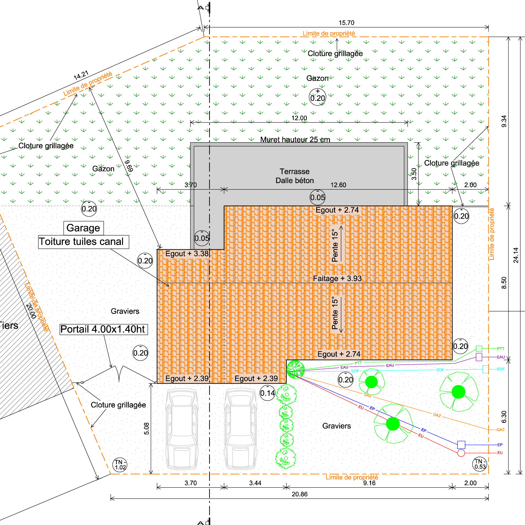 - un plan d’implantation de la construction sur le terrain sous forme de plan de masse détaillé (avec cotations, emplacement des réseaux, points de niveaux, clôtures, etc.)